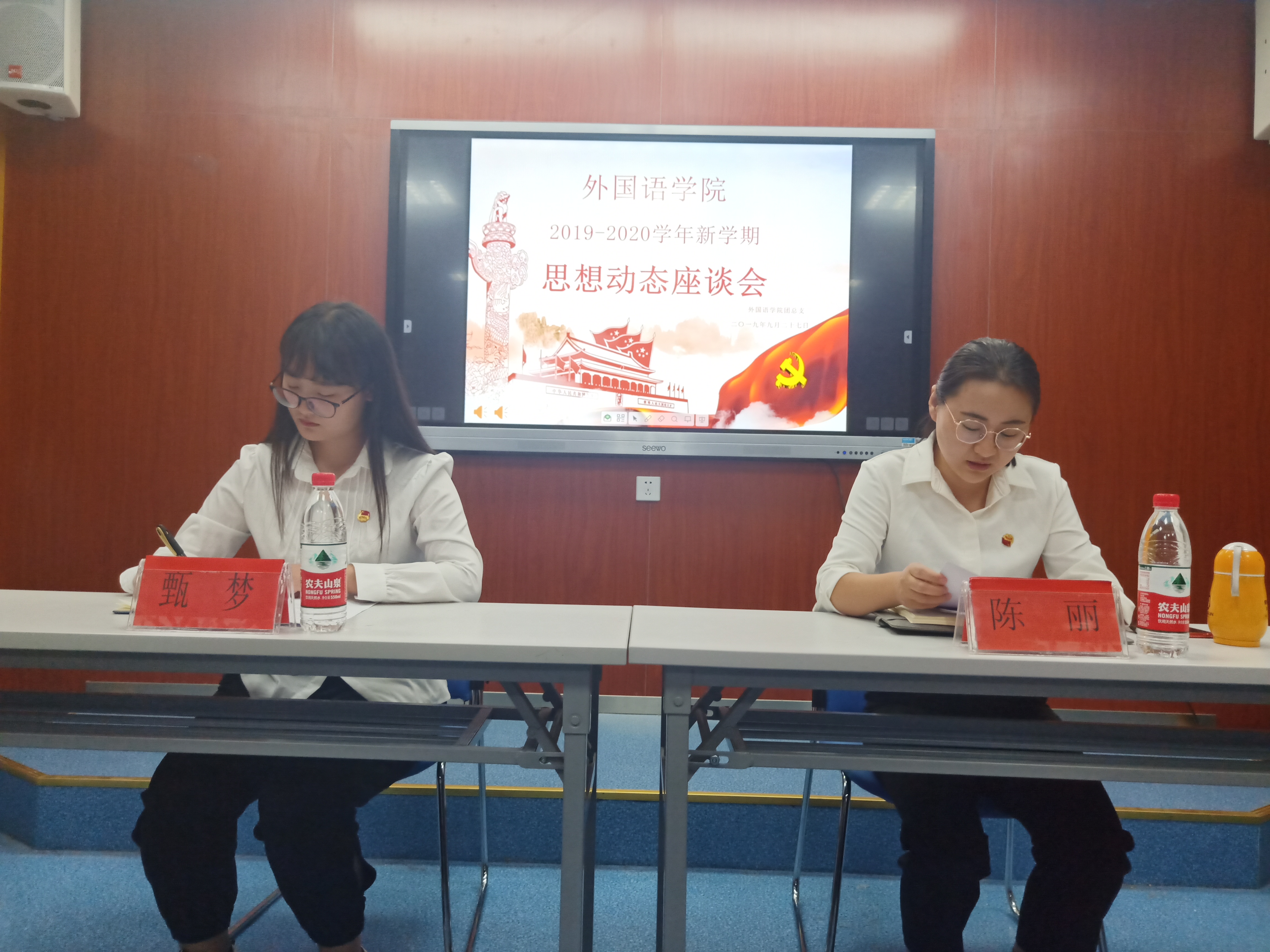 本网讯(通讯员:陈丽)为及时了解外国语学生新学期返校后的思想动态,掌握班级支部舆情,并安排部署新学期团学工作重点,9月27日中午,外国语学院召开了2019年秋季新学期学生思想动态座谈会,外国语学院团总支书记陈丽、副书记甄梦、各团支部书记、学生组织负责人等参加了会议。