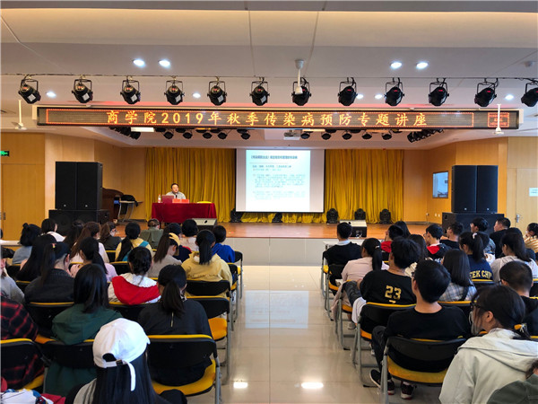 本网讯(通讯员:肖华君)为了有效预防常见传染病的发生,进一步增强师生对常见传染病的防控意识,10月18日,商学院邀请安徽省疾病预防控制中心应急办主任吴家兵作“学校传染病的预防与控制”专题讲座。商学院行政副院长徐志凤、全体学工人员、班级代表共300余人参与了讲座。