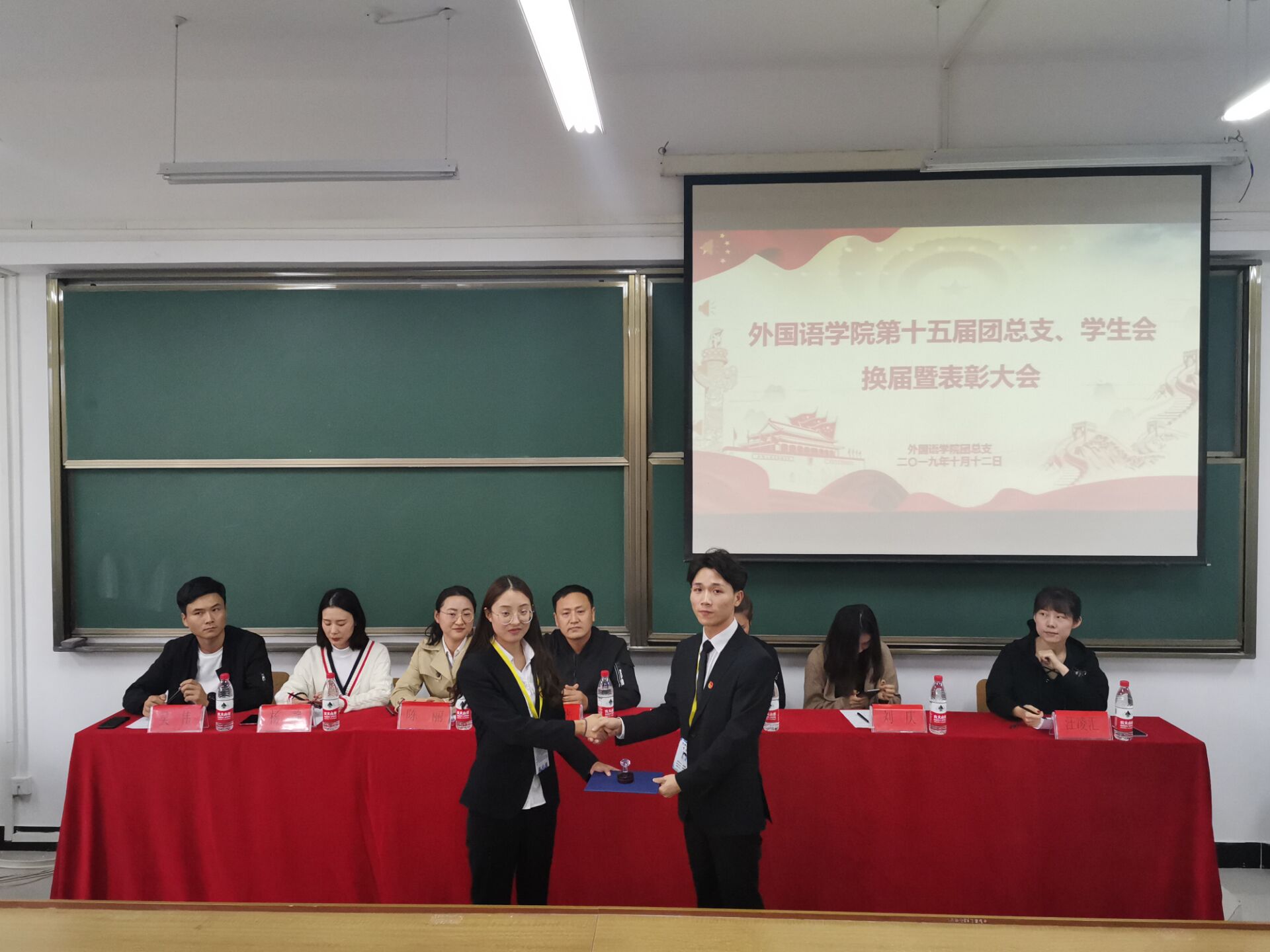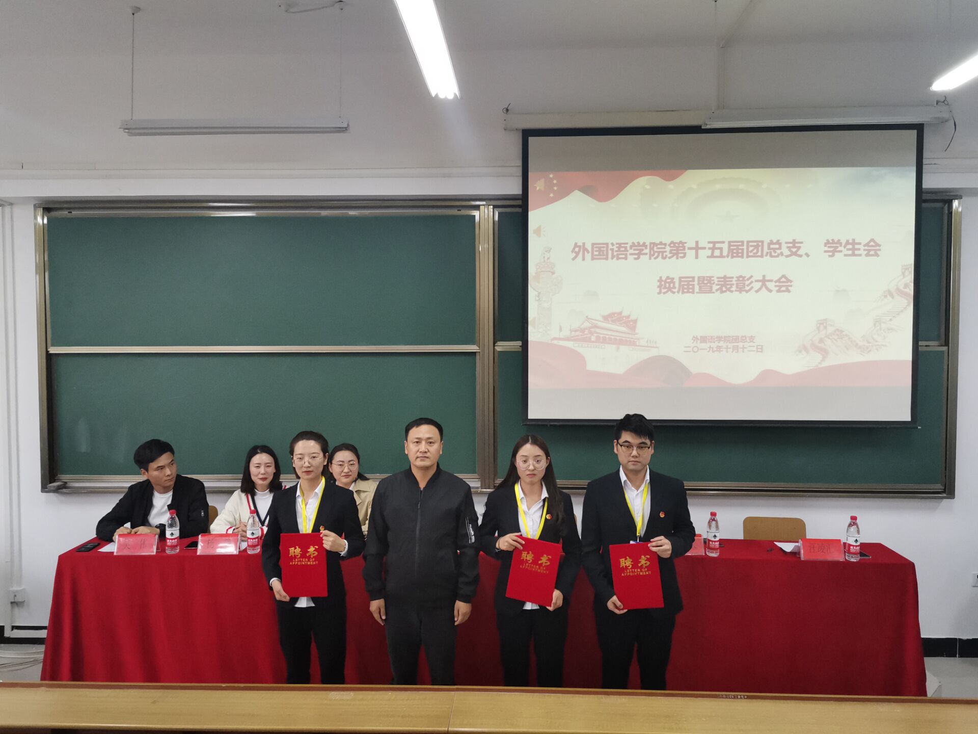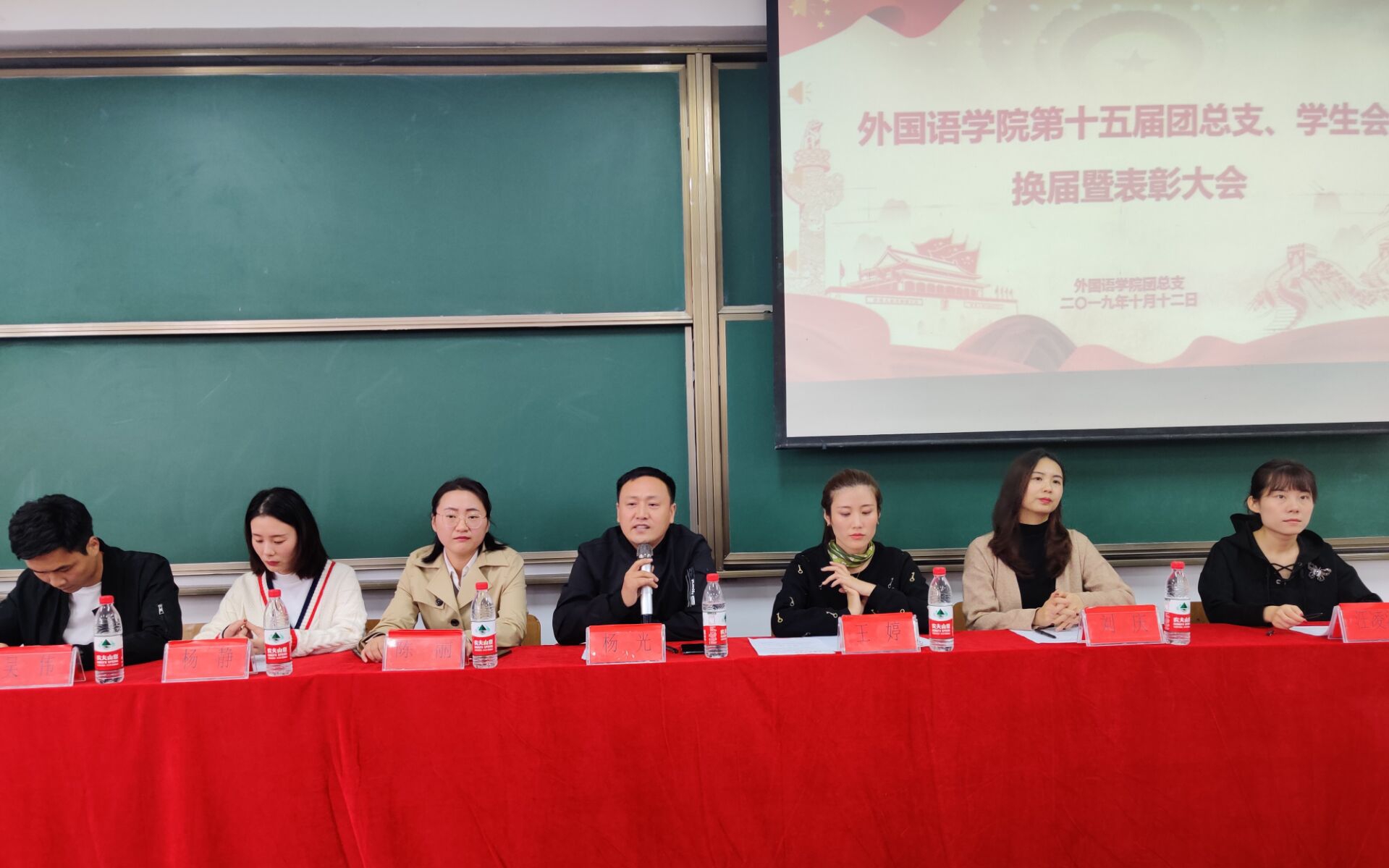 本网讯(通讯员:陈丽)为进一步加强外国语学院团总支、学生会的组织建设,更好地提高团总支、学生会学生干部的自我教育、自我管理、自我服务意识,外国语学院于10月12日中午举行了新一届团总支、学生会换届暨表彰大会。外国语学院党总支副书记杨光、团总支书记陈丽等全体学工人员参会。