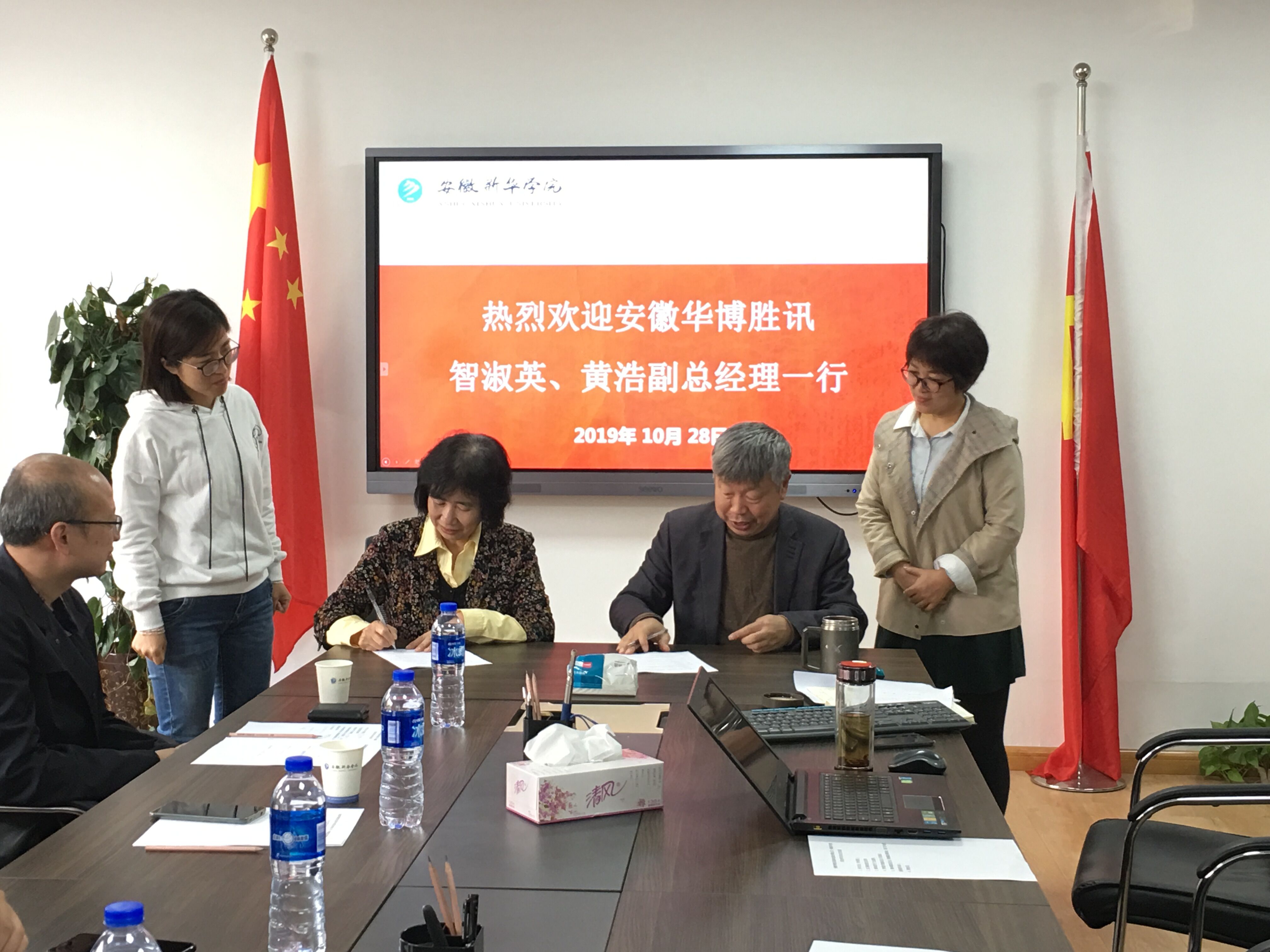 洽谈交流中,双方就邀请企业做学术报告,接纳信息工程学院的教师和学生进入安徽华博胜讯信息科技股份有限公司进行实习实践锻炼,图书信息系统及无人书店建设; “导游辅助讲解系统”、“基于云平台的选举测评系统”等可合作课题项目进行了讨论。最后双方进行了校企共建实习基地签约。