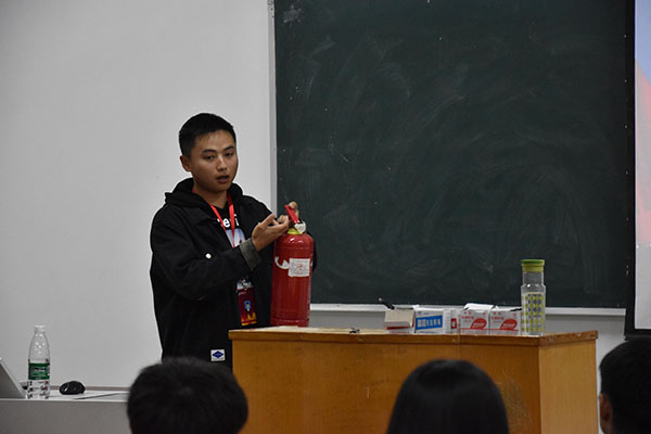 讲座在从真实案例出发,消防志愿者大队成员结合相关图片和视频资料,深入浅出地讲解了消防安全的重要性,全面介绍了学生们在日常学习、生活中应注意的消防安全细节以及火灾中如何自救、逃生等消防知识。在火灾发生时,要求学生首先沉着冷静,服从指挥;其次可以沿墙壁边缘逃生,尽量降低身体高度减少吸入有毒气体;再是疏散逃生要有序,按照既定线路快速安全撤离。接着结合典型消防案例,详细地讲解了防火、灭火器使用、正确报警等知识,并对消防器材的正确使用做了细致的讲解。讲座过程中同学们们认真聆听,积极参与,对消防安全知识有了更深刻的了解和认识。在最后的演练中,参与演练的学生按照规定路线,有条不紊地安全撤离。