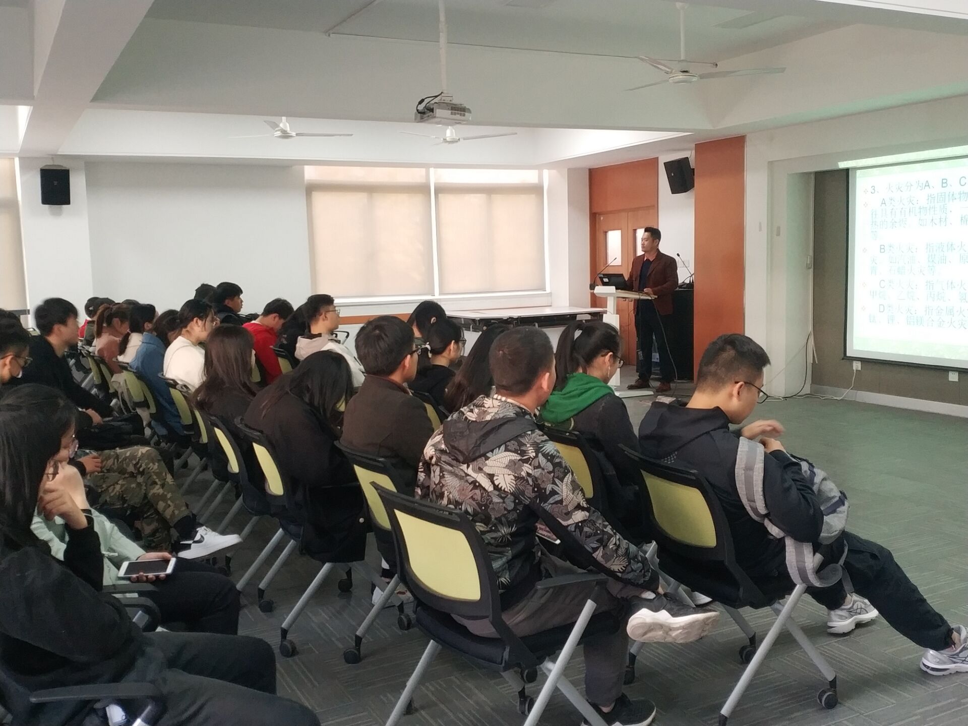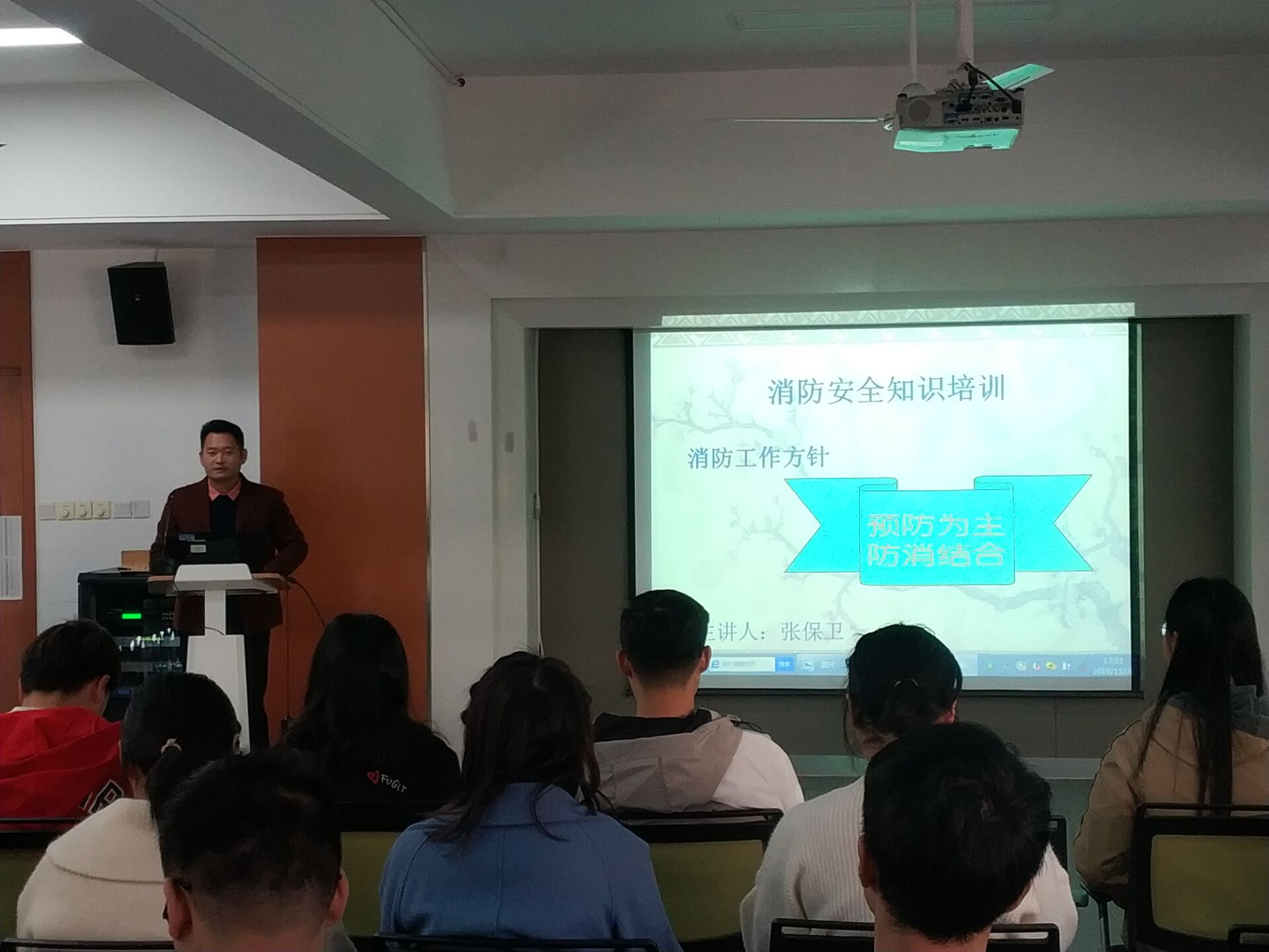 本网讯(通讯员:汪涵涵)为了更好的组织学生参加消防安全宣传月活动,树立消防意识、熟悉消防知识、掌握消防自救能力。11月20日中午,国际教育学院邀请beat365在线体育官网登录入口保卫处副处长张保卫为学生干部和寝室长做消防安全知识讲座,讲座由行政兼学管秘书汪涵涵主持。