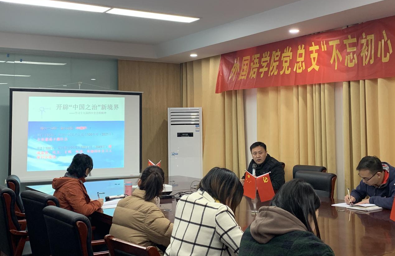 本网讯(通讯员:郭晓菊)11月22日,外国语学院党总支组织开展“不忘初心、牢记使命”主题教育——专题形势政策教育。总支委员及全体教师党员参加。