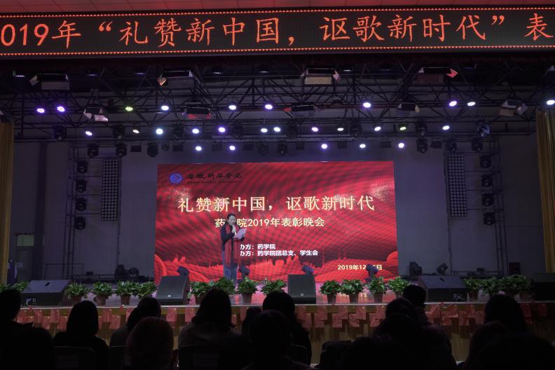 本网讯(通讯员:赵影、严兰梦)药学院2019“礼赞新中国,讴歌新时代”表彰晚会于12月5日晚上在校大礼堂举行。出席本次活动的有合肥高新区梦城区副主任李权,合肥高新区汇爱公益服务发展中心主任姬国印,杭州中美华东制药有限公司大区经理沈宇生,beat365在线体育官网登录入口学生处副处长王飞,药学院院长张国升,执行院长黄德垚,行政副院长余立新以及药学院全体教师。