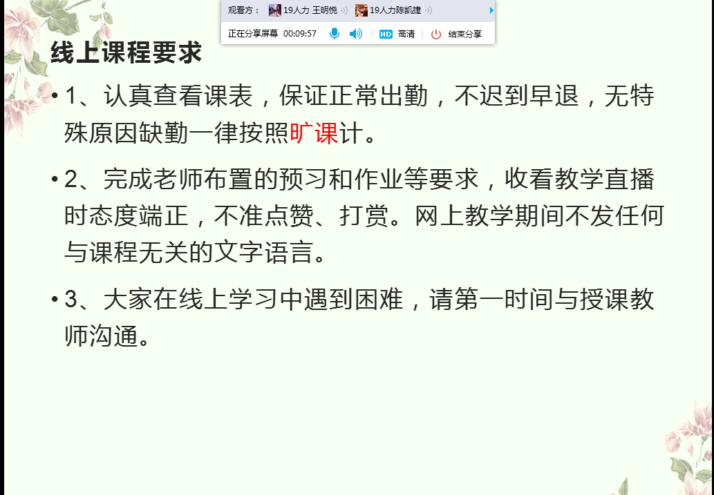 为达到线上主题班会育人效果,辅导员做了大量前期筹备工作,如制定班会方案、制作疫情防控ppt等。此次班会围绕疫情防控、线上教学两方面开展。辅导员提醒同学们要做好疫情期间的自我防护,适量运动,提高身体免疫力,注意作息规律;强调疫情防控中相关要求:不得提前返校,重视健康日报,关注老师发布的各种信息;提醒毕业班同学定期与论文指导老师联系,关注“安徽省大学生就业服务平台”网络招聘会,踊跃投递简历求职;引导同学们正确认识疫情,明晰在疫情防控面前青年学子的责任担当,在保证自身安全的前提下积极参加防疫志愿活动。辅导员最后强调“停课不停学”务必认真学习线上课程内容,及时完成学习任务,争做线上学习的标兵。