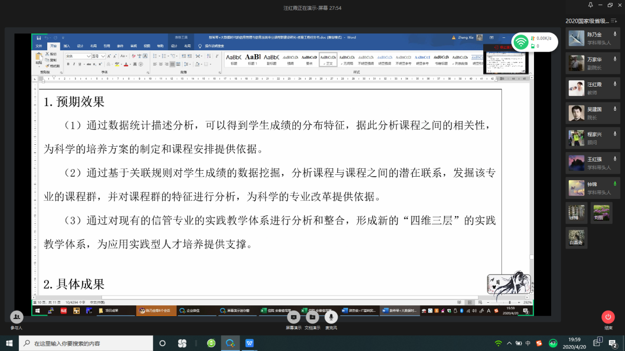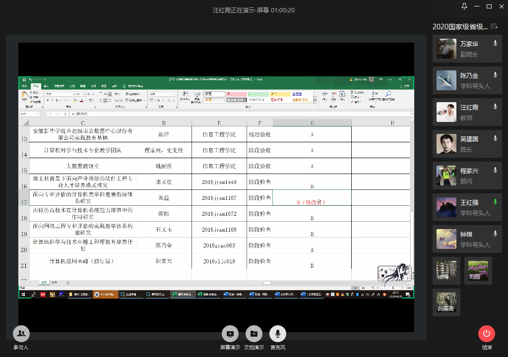 本网讯(通讯员: 汪红霞)根据beat365在线体育官网登录入口《关于开展国家级、省级、校级“质量工程”项目年度检查验收工作的通知》文件要求,为进一步加强省校级各类“质量工程”项目建设与管理,更好地推进各项目的顺利实施,提高各项目检查验收的质量,4月20日,信息工程学院通过企业微信平台召开2020年“质量工程”项目检查验收评审会,中国科学院合肥智能机械研究所王红强教授、安徽工程大学陈乃金教授、合肥师范学院钟锦教授,信息工程学院顾问程家兴教授等9名校内外高级职称专家组成评审组。会议由吴建国主持。