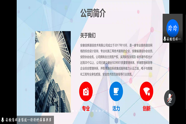 安徽信辉通信技术有限公司成立于2017年10月,是一家专业通信网络的综合设计咨询,专业化施工等技术服务的企业。公司主要经营范围是有线通信、无线通信网络的规划、咨询、勘察、设计;通信工程施工、维护;通信产品研发、销售;通信系统集成;安全技术防范产品销售及工程设计。在招聘会上,吴经理通过PPT方式从业务范围、发展历程、人才培养以及福利待遇等方面向学生系统的介绍了公司概况.他重点表明,希望吸纳有责任意识,有进取和专研精神的毕业生加入,主要招聘职位为土建设计师。