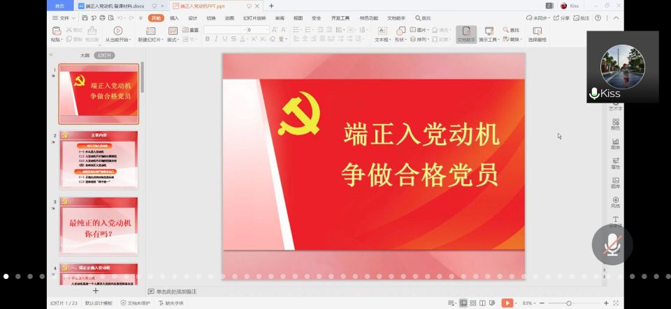 本次课程主要围绕端正入党动机端、按照党员标准严格要求两个方面展开。首先,柯姗姗向学员们阐述了入党动机的内涵。接着,她以学生的入党申请书为例,解释并分析了不正确入党动机的表现及因素。再接着,她详细全面地为与会人员讲解如何端正入党动机,同时,她结合新形势下发展党员工作的要求表示学员们应自觉加强党性修养、自觉处理入党过程中的矛盾关系等。随后,她以通俗易懂的表达方式,将正反面事例与理论知识紧密联系,要求学员们要对自己高标准、严要求,坚持做到“四个统一”,认真学习政治理论知识,不断端正入党动机。最后,她对同学们提出殷切期盼,她强调“每一位同学应该眼中有星辰大海,胸中有家国情怀,手中要有为祖国实现社会主义现代化的招”。