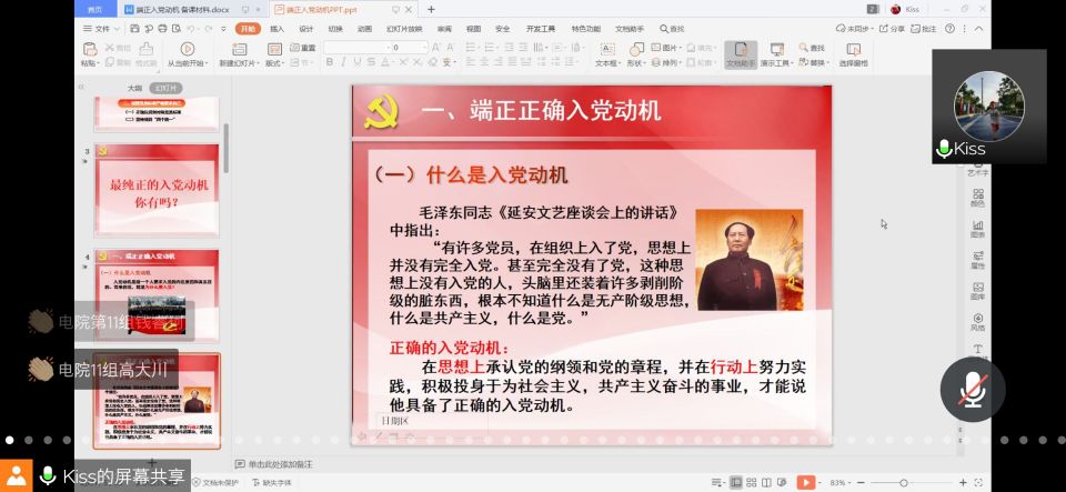 本网讯(通讯员:李靖)为了让同学们了解党的最高理想与奋斗目标,做好党课的理论学习工作,牢固树立共产主义的理想,坚定共产主义必胜的信念,外国语学院分党校与电子通信工程学院、国际教育学院于近日联合开展了以“端正入党动机,以实际行动争取入党”为主题的线上理论课,本次理论课的主讲人是电子通信工程学院的党总支副书记柯珊珊,参加培训的人员是分别来自三个学院的共270名入党积极分子。
