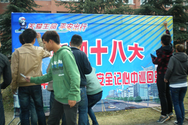 万玉荣用详尽的数据通报全国、合肥及高新区近几年发生的交通事故,分析了当前的交通安全形势;详细介绍了交通法规及道路出行注意事项,并通过事故案例、视频等阐述了交通事故对个人、家庭、社会所带来的危害。触目惊心的事故案例及场景深深的触动了大家,同学们深受教育。讲座结束后,组织同学们观看了交通安全图片展,并开展了 “喜迎十八大,牵手平安行暨交通安全记心中巡回签名”活动。
