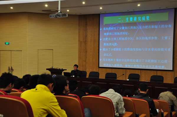 本网讯(通讯员  吴韬,摄影  万士斌)为扩展土木师生在岩土工程方面的学术视野,吸引广大教职员工积极投身科研工作,提高青年教师的科研水平。11月9日下午,土木与环境工程学院在学术报告厅举行了《合肥市岩土体工程特征及地基划分》的学术报告,本次报告邀请到了合肥工业大学资环学院王国强教授主讲。学院相关专业的教师及部分土木工程专业学生近百人参加了本次学术报告。
