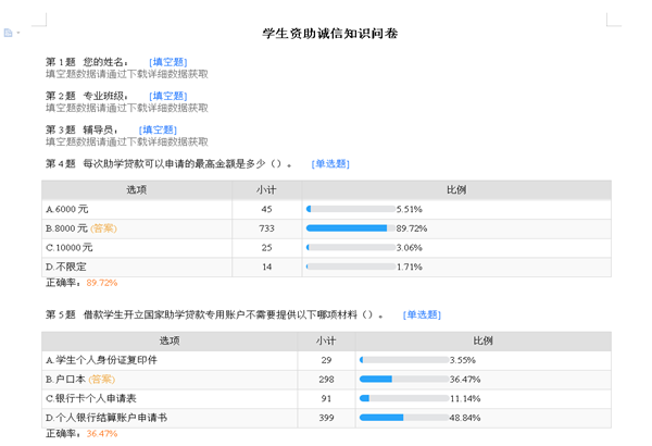 同时,学院以线上资助诚信知识问卷的形式开展了资助知识普及宣传,近千名办理助学贷款的在校生积极参与,知识问卷不仅设置了如助学贷款的类型、申请助学贷款需要的材料、还款方式等知识普及型问题,还专项设置了如不按时归还助学贷款有何不良影响、对助学贷款的违约行为有哪些处理措施等诚信教育类问题,起到了普及资助知识、加强诚信教育的作用。