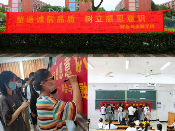 精心组织,创新形式。活动期间,财会与金融学院开展形式多样的活动。在学校范围内组织“心存诚信之钟,争做有信之人”为主题的征文比赛,围绕大学生资助与诚信、诚信资助与中国梦、诚信与个人成长成才等方面,突出“诚信”这一主题;在财会与金融学院范围内组织“诚于心,信于行”知识竞赛,通过线上初赛,线下复赛的形式,让更多的学生了解诚信的重要性,提高其防骗意识和能力;开展“爱心筑梦,诚信你我”手抄报展示活动,该项活动主要针对2019级新生,同学们借助已了解的资助知识,诚信意识,充分发挥想象,通过手中的笔勾勒出一幅幅精美的画作;开展“讲诚信,知感恩”横幅签名活动,鼓励同学们树立诚信意识,做一名诚实守信的学生。签名学生纷纷表示,会时刻严格要求自己,树立诚信个人形象,遵循诚信信贷准则,以实际行动向社会证明自己是个懂得回报、诚实守信的人。