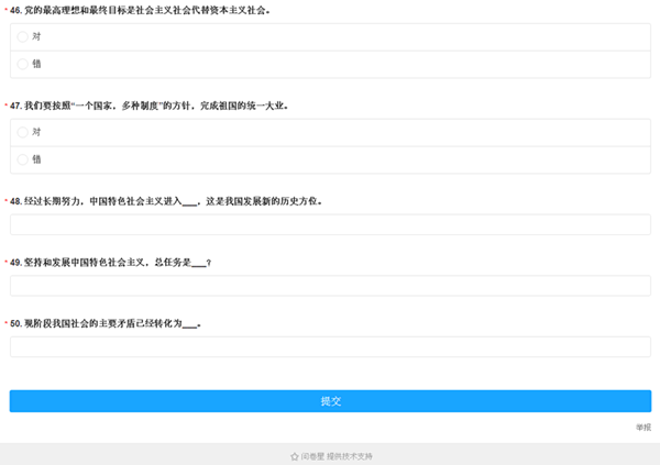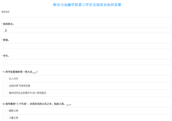 第一学生党支部和第三学生党支部联合组织线上党史竞赛,利用问卷星网络平台,设置50道题目,题型分别是:单选,多选,判断,填空。测试党员对党史知识的掌握情况,达到以赛促学的目的。