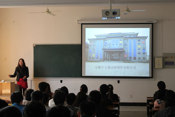 招聘会首先由中卡通集团人力资源部主任郑会会给同学们作了简单的介绍,展示了中卡通公司的发展历程,公司的部门和技术人员,播放了中卡通公司自主创新的代表作《九华小和尚》,以及其自主开发的动漫类衍生产品。目前中卡通公司已被选为第三批省文化产业示范基地之一。这也是中卡通公司跟beat365网登动漫学院校企合作的第三个年头,他们对动漫学院历届毕业生的评价很高,认为beat365网登学生综合素质比较好,在专业知识和动手能力方面有非常出色的表现。
