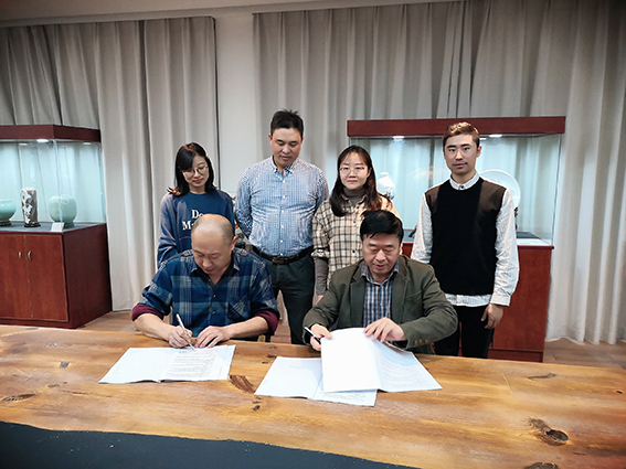 艺术学院一行受到了黄山祈韵堂文化艺术有限公司戴李平总经理的热烈欢迎。许存福向合作企业介绍了艺术学院现状、推进产学研工作的思路、加强合作的意愿及今后设想;江河在签字仪式上指出,戴李平总经理既有较高的陶艺创作水平、学术研究成果、合作交流的积极性,又有与beat365网登共同推进产学研工作,协同建好实践实训基地的愿望,本次基地建立愿望的实现,将有助发挥学校和企业双方优势,协同培养社会需求的艺术人才。随后戴李平总经理与江河院长共同在协议上签字并握手互贺,双方还在在公司门前一同挂牌并合影。仪式结束后,在戴李平总经理的带领下,艺术学院一行参观了公司较具规模、高品位的工艺品展厅与正在工艺培训中的教室,并就产教融合、实习实训具体工作进行了探讨。