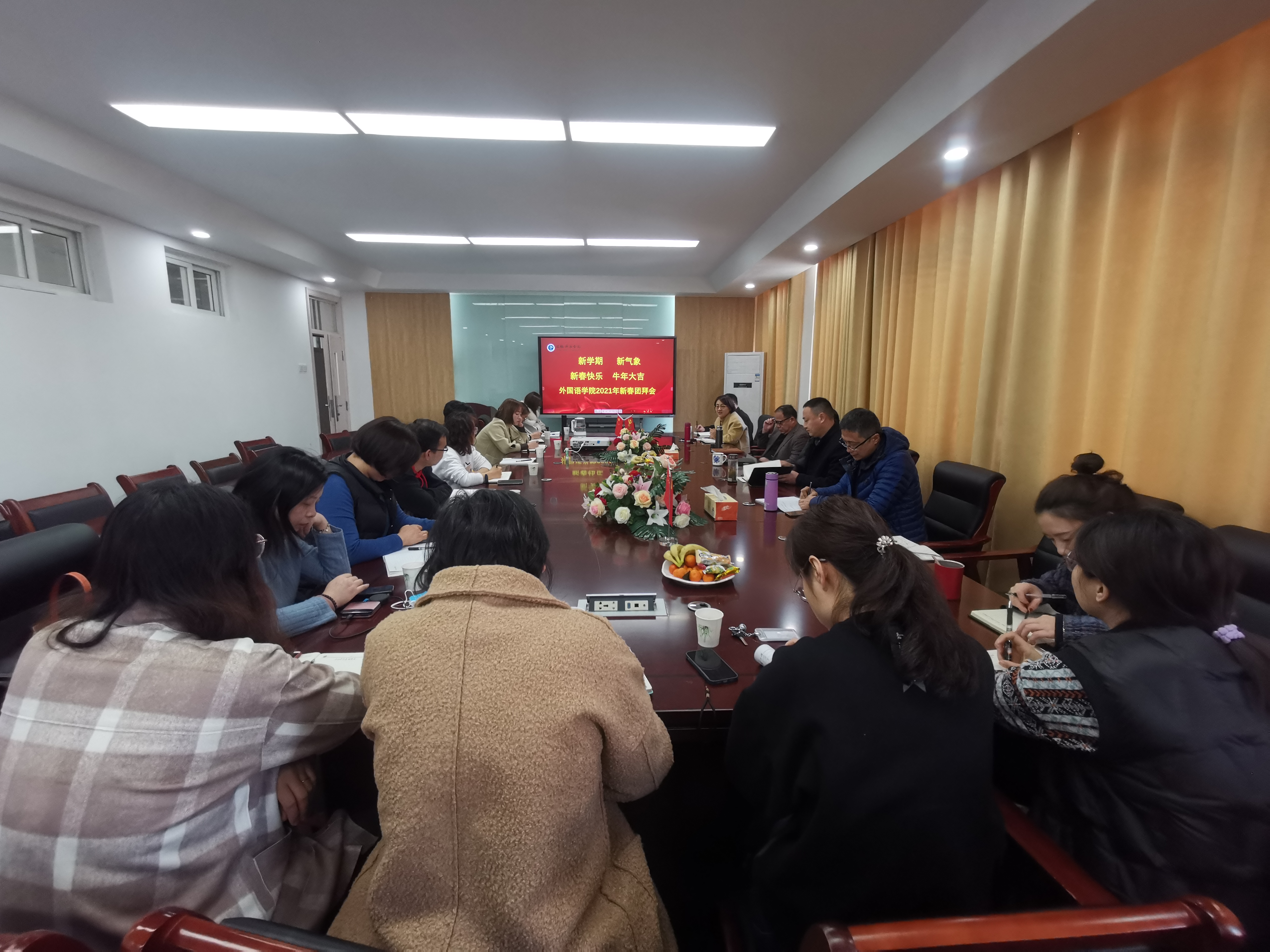 会议开始,院长助理陈丽代表外国语学院全体管理人员给各位领导、教师送上了新春的祝福,并提醒各位新学期已开始,各位要调整好状态,提前谋划新学期的工作计划。随后提醒大家学生返校时间为3月1日,学工口和教师口要做好提前迎接学生的准备,恢复上课的时间暂时等待通知为准。接着教学副院长王志宏整理了2021年教学工作的重要计划:要结合现状,加强专业规划与建设;深化教育教学改革;通过“外引内培”的方式强化师资队伍建设,注重课堂内外相结合,提升教育教学效果。