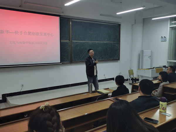本网讯(通讯员:郑帅)为深化校企合作及人才培养力度,拓宽学生实习渠道,加快网红人才培养基地建设,培养融媒体营销、运营、服务人才,快手合肥创新发展中心主任何曙光一行走进学校,给文传学子带来精彩的企业实习宣讲。文传学院副院长(主持工作)洪玉、教学副院长王鹏、新闻系副主任张倩出席了本次宣讲会。播音与主持艺术、广播电视编导、新闻学、新闻采编与制作、空中乘务等专业一百多位学生参加了宣讲,宣讲会由艺术表演系主任助理郑帅主持。