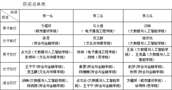 本次比赛分预选赛、半决赛、决赛三部分进行,设有男子单打、女子单打、男子双打、女子双打、男女混合双打五个项目,分小组进行对决,各项目取前三名,共吸引了全校数百名同学积极参加。