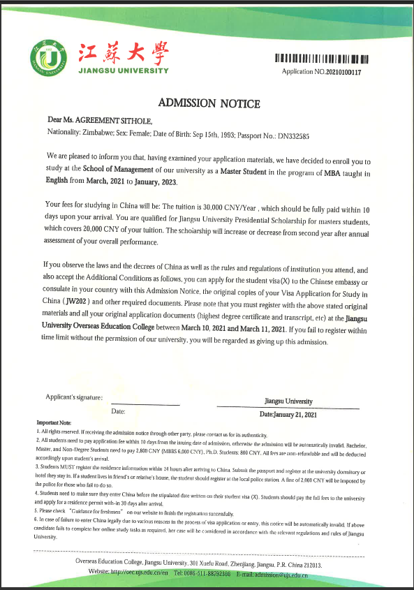 本网讯(通讯员:吴海峰)beat365网登国际教育学院留学生AGREEMENT SITHOLE(中文名李桐)获江苏大学工商管理专业研究生录取,并获2万元奖学金。李桐为beat365网登首位获得境内高校研究生录取的留学生,这也标志着beat365网登“留学新华”项目取得新的重大突破。