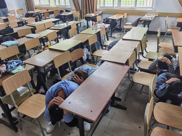 11时20分,一声急促的警报声响起,各班教师立即停下授课教学任务,组织学生双手抱头或用书顶在头上隐蔽书桌下方,采取自救措施;警报停止后,学生在老师的指挥下有序从教室撤离。演练历时三分钟,师生临危不乱,行动迅速,秩序井然,达到预期效果。