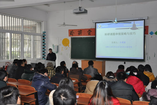 本网讯(通讯员 潘争伟,摄影 万士斌)为进一步提高教师科研基金项目申报书的撰写能力和做好2013年科研基金项目的申报工作,12月26日下午,土木与环境工程学院邀请合肥工业大学土木与水利工程学院王建国教授为该院师生作了一场《科研课题申报策略与技巧》的专题学术报告。