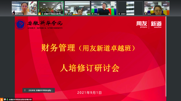 本网讯(通讯员:满春燕)为推进国家级一流本科专业建设,做好2021级财务管理(用友新道卓越班)开班的前期准备工作,9月1日下午,财会与金融学院与用友·新道科技股份有限公司就云财务管理会计师方向的人才培养方案进行了探讨和磋商,进一步优化了课程体系。根据疫情防控的要求,北京总部的专家利用云端在线上同步参与研讨,新道科技教育服务部教育规划顾问黄锐、安徽校企合作总监康阿朋来到现场,财会与金融学院副院长张璐、系主任王玮、专业负责人李海燕和师资研修院的骨干教师也参加了此次研讨会。会议由张璐主持。