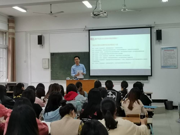 在报告中,周景首先提出人力资管理工作在企业管理中的角色定位问题,引发在场同学的思考,接着他介绍了谷歌、苹果、华为等国内外知名企业的招聘流程,并对比一些中小企业招聘的具体表现,让同学们对高效规范化的招聘工作有了整体认识;接着分析了要成为一名优秀的HR要经历的三个阶段,使同学们对将来的职业发展路径有了进一步的了解和认识,最后周景老师结合2018级人力资源管理专业的同学们即将踏上工作岗位的实际情况,对在场的毕业生们的求职就业给出相关的建议和指导。