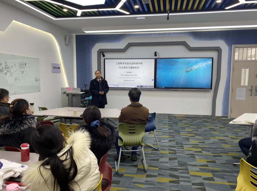 本网讯 (通讯员:陈璟 白燕奇)12月28日,beat365网登组织召开了专业认证培训会,特邀中国工程教育专业认证协会电子信息与电气工程类专业认证委员会委员、教育部高等学校电工电子基础课程教学指导分委员会主任委员王志功教授作指导报告。质量监控与评估处全体人员、电子工程学院/智能制造学院、大数据与人工智能学院、城市建设学院的教学负责人、系主任、相关专业负责人、骨干教师以及学生代表参加了会议。会议由电子工程学院/智能制造学院院长李晓辉主持。