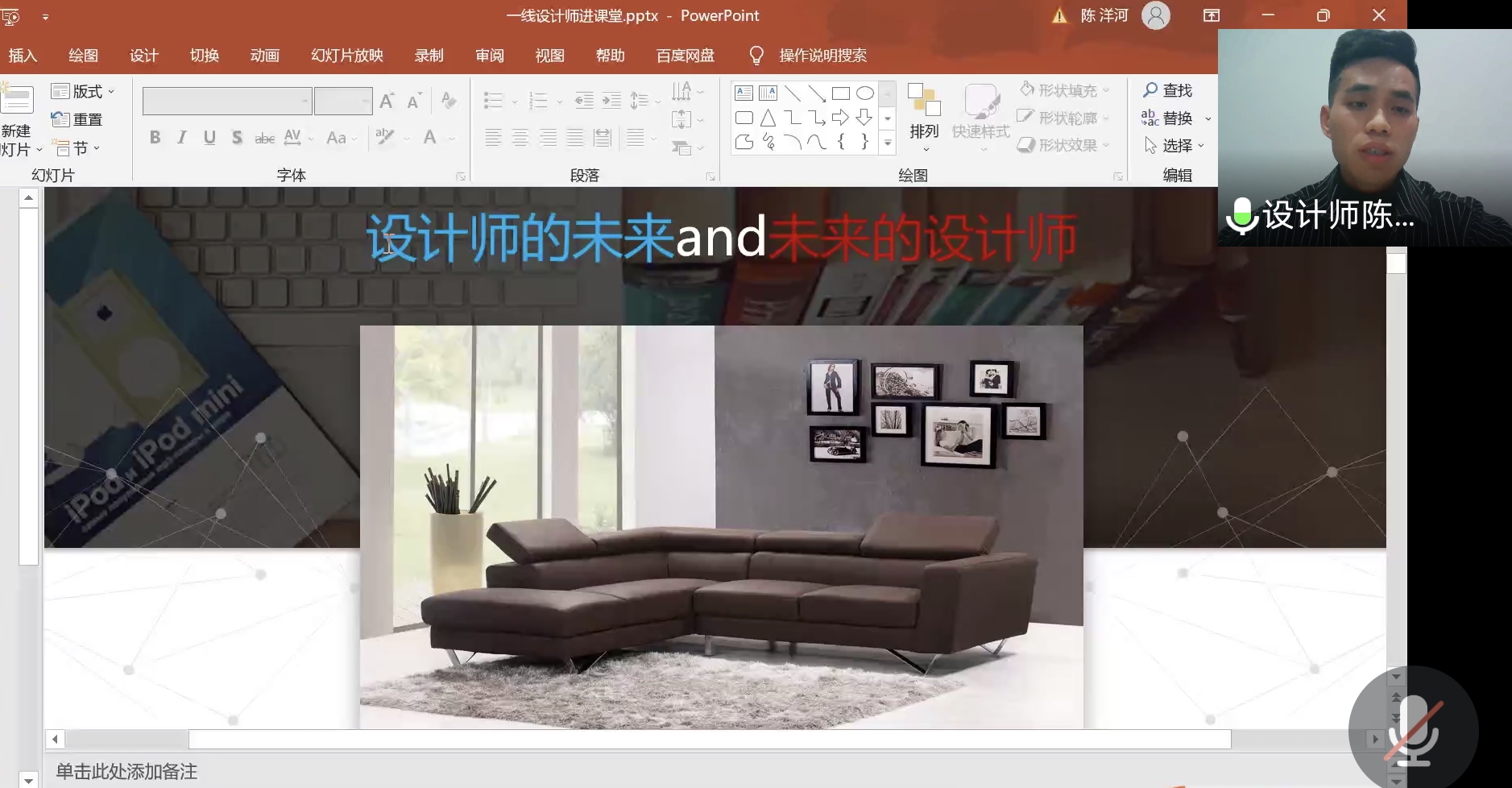 本网讯(通讯员:梅玉婷)为进一步深化教育教学改革,艺术学院积极开展“一线设计师进课堂”教学活动,根据《人机工程学》课程教学计划的安排,提升学生的实践创新能力,让学生能够更好地与社会接轨。12月27日,艺术学院邀请福建泉州众创美居装饰有限公司总经理陈洋河为2019级产品设计专业学生开展了题为“设计师的未来and未来的设计师”线上讲座。