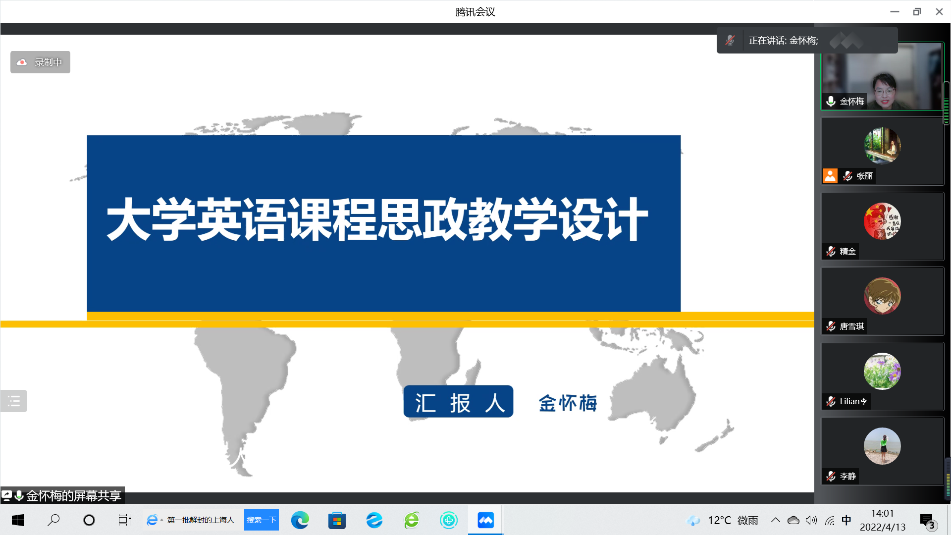 金怀梅主要从课程思政的意义、如何积累思政素材、如何挖掘教材中的课程思政元素等几个方面,充分结合教学实例,深入浅出地与大家进行了课程思政教学设计的探讨。研讨会上,教师们还就课程思政教学研究、论文发表等相关话题展开来积极讨论。本次线上教研活动组织有序,教师参与度高,线上互动和讨论热烈。