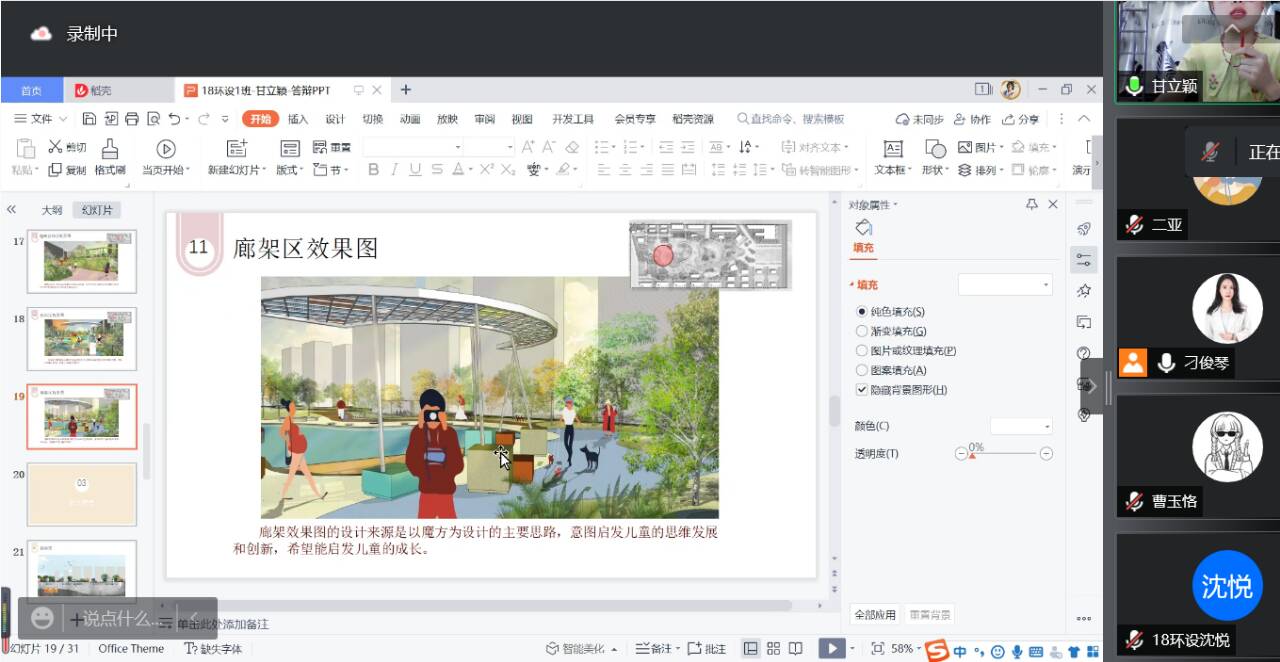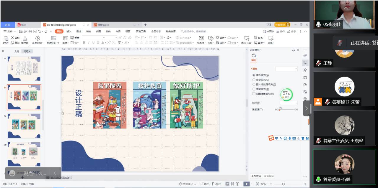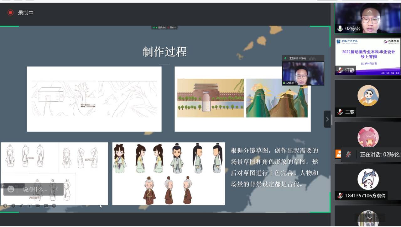 答辩现场,学生通过答辩PPT的在线演示,阐述了毕业设计的选题依据、设计思路、创作方法、创新点、经验总结等,在提问环节,答辩组教师提出了相关修改意见与建议。