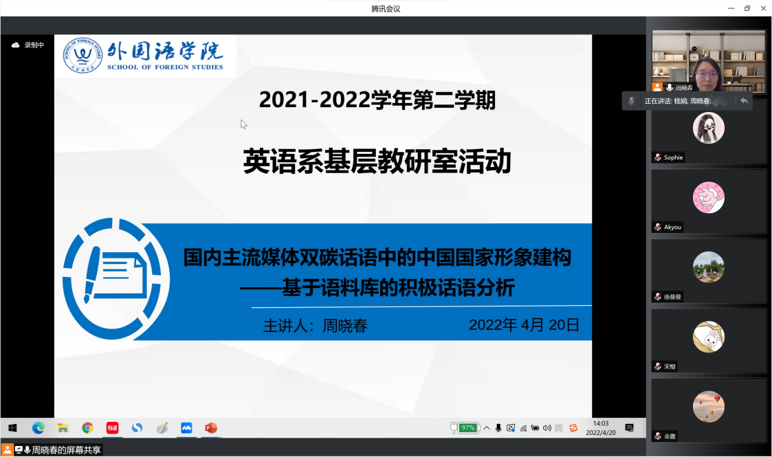 本网讯(通讯员:周晓春)为进一步推动疫情防控期间基层教研室建设,促进教师交流与发展,外国语学院/国际教育学院英语系于4月20日下午在腾讯会议平台开展了本学期第二次线上基层教研室交流活动。本次活动的主讲人为周晓春副教授,英语系全体教师参与研讨,活动由英语系副教授钱娟主持。