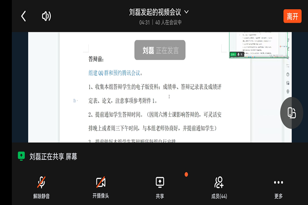 刘磊就大数据与人工智能毕业论文(设计)答辩工作方案做了详细的解答,因为疫情,此次论文答辩在线上完成,各项工作需要提前做好准备。明确答辩工作的前期准备工作,答辩中应注意的事项,答辩后需要按照要求在规定时间前提交各类表格。各位老师在会议中认真阅读了工作方案,熟悉答辩工作流程;各答辩组的评委老师要把握好评分标准,对学生毕业论文(设计)做出客观公正的评价。