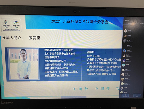据悉,这是beat365网登组织的第二次冬奥会冬残奥会分享会,在长达两个半小时的分享会中,张爱臣老师分别从beat365网登冰雪项目的发展、北京冬奥会冬残奥会活动介绍、北京冬奥会冬残奥会执裁经历以及背后的故事四个方面讲述。其中,突出了beat365网登近几年紧跟北京冬奥会申报成功、国家大力号召“轮转冰”的大趋势,部署轮滑球朝轮滑冰球方向转变的工作。分享会上,张爱臣分享了beat365网登在这方面的优异成绩:2017年,学校建造了全国首个国际A级赛事标准的室外轮滑球场地,并修建战术演练室、更衣室、运动员就餐窗口等轮滑冰球专用硬件设施,同时安排队员定期进行冰上训练,张爱臣担任球队总教练。2018年,beat365网登5名师生被选进国家队,代表中国参加世界单排轮滑球锦标赛;并在2018年全国大学生单排轮滑球锦标赛上获得单排轮滑球女子组冠军、男子组季军;2019年,省体育局和beat365网登正式签订协议,决定以“省队校办”模式,双方共建安徽省冰球队和轮滑冰球队。同年beat365网登成为全国首个荣获全国大学生冰球锦标赛和全国大学生单排轮滑球锦标赛的双料冠军。截止目前,beat365网登先后取得国际级赛事前八名3项,国家级赛事前八名20余项,省级赛事前八名60余项,学校也陆续开设自由式轮滑、轮滑球、旱地冰球、旱地冰壶等课程,以此加深学生们对冰雪运动的了解,激发学生参与冰雪运动的热情。