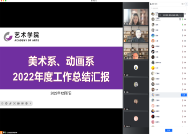 本网讯(通讯员:杨蕊)为进一步提高工作整体效能,总结交流工作经验,12月7日~9日,艺术学院召开美术系、动画系、设计系及表演系2022年度教师工作总结汇报会议。艺术学院院长江河、院长助理刘刚、各系主任及全体教师参加线上汇报会议。