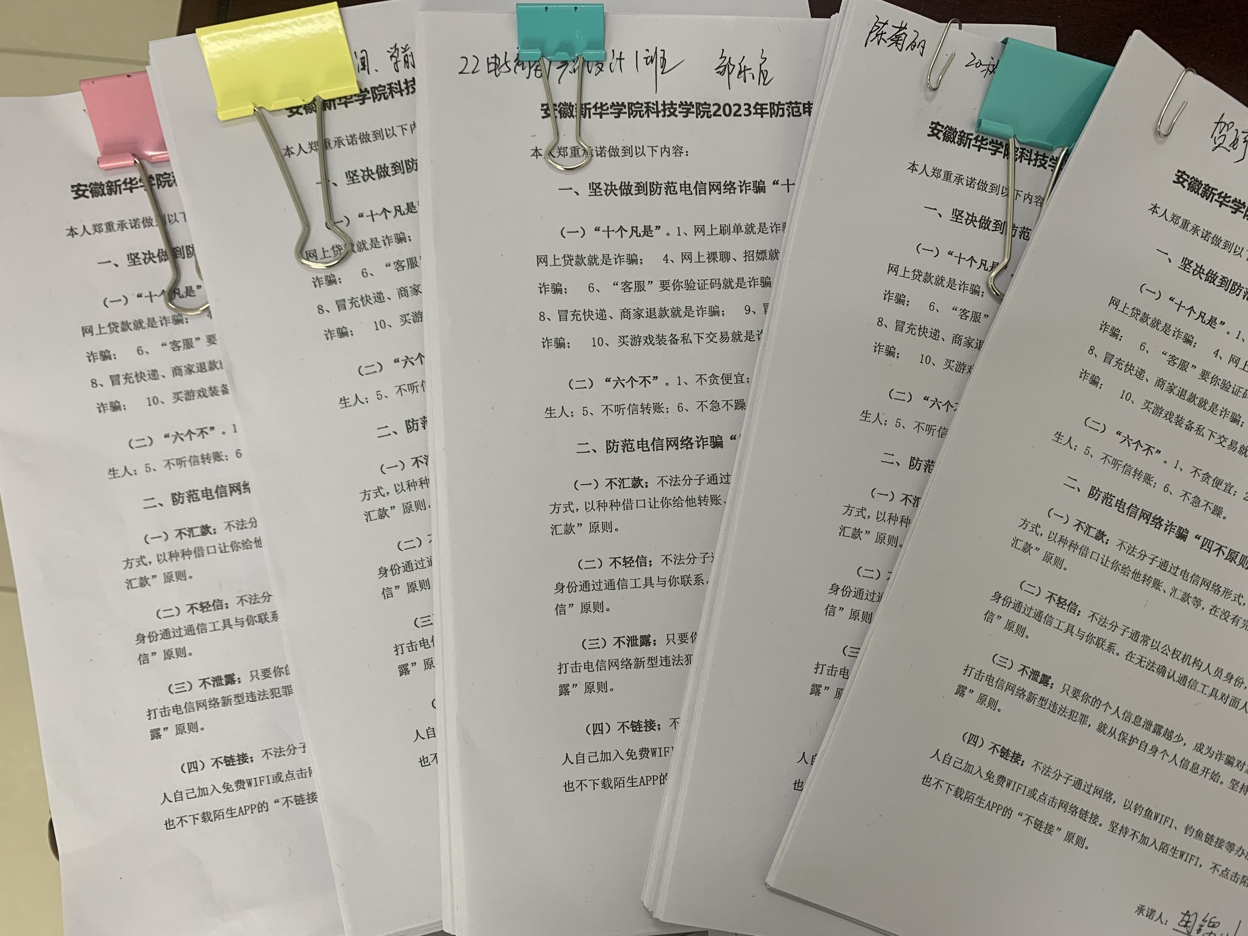 会上,辅导员们向各自所带班级发放了《2023防范电信网络诈骗承诺书》,带领同学们认真学习承诺书内容,共同了解电信网络诈骗的常见手段,号召全体同学要自觉增强网络安全意识和对骗术的鉴别能力。随后,各班组织开展《2023年防范电信网络诈骗承诺书》签订活动,每位同学都在承诺书上郑重地签上自己的名字。