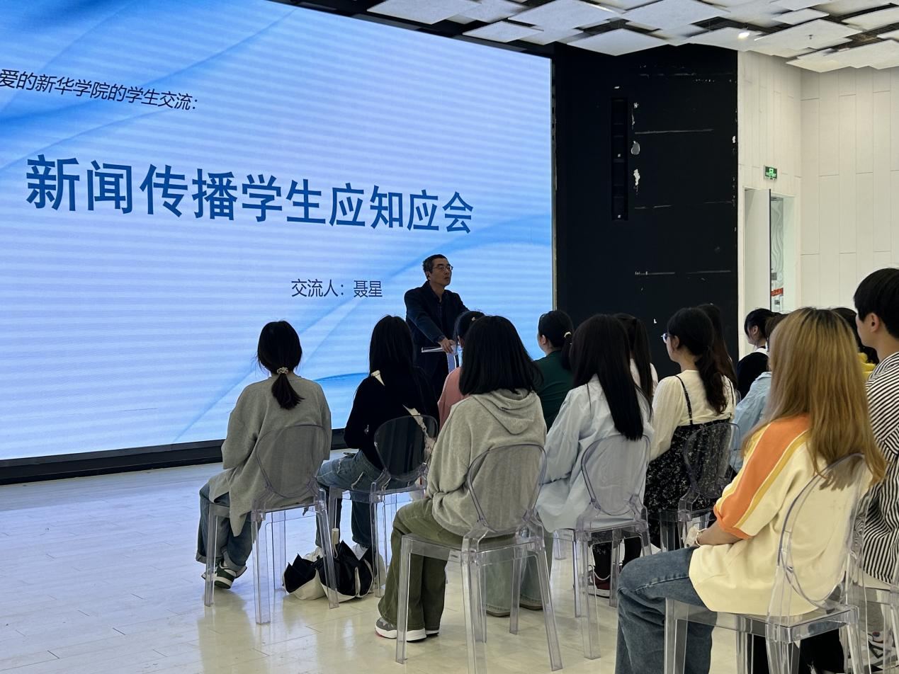 安徽广播电视台特别报道部聂星主任做主题分享。他分别从“为什么学新闻专业”、“新闻的门槛”、“成长为一个合格的新闻人应具备怎样的素质”和“入职记者时,基础的基础是消息的采写”等五个方面来做分享。同时,聂主任向学生们展示了报纸、广播电视和网络新闻内容三者的语言特点和区别,提到了党中央对新闻工作者的要求。他提醒同学们“要树立信心、保持热爱,不要好高骛远。从事新闻工作要脚踏实地,践行‘四力’,用心用情记录新时代。”