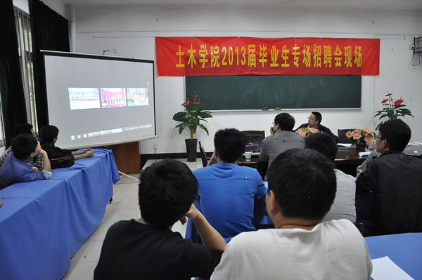 本网讯(通讯员  俞士毛)2013届毕业生就业工作已经临近尾声,为进一步提高毕业生的就业质量,给困难毕业生提供优质的就业机会。5月17日下午,土木与环境工程学院举办了中建三局专场招聘会,约40名毕业生积极应聘,效果良好。