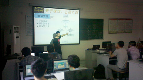 出席此次答辩会的领导有电子通信工程学院副院长田永泰、安卓越安徽区总经理张帅、安卓越高级讲师张科勇。会议由安卓越安徽区运营部总监姜军主持。 姜军首先介绍了本次答辩会的概况。随后,与会领导向安卓班学员颁发教育部MITT证书。安卓越班学员进行项目答辩,主要从项目的开发意义、开发功能、开发所运用到的知识点等方面分别进行阐述。答辩结束后,田永泰进行了点评发言。