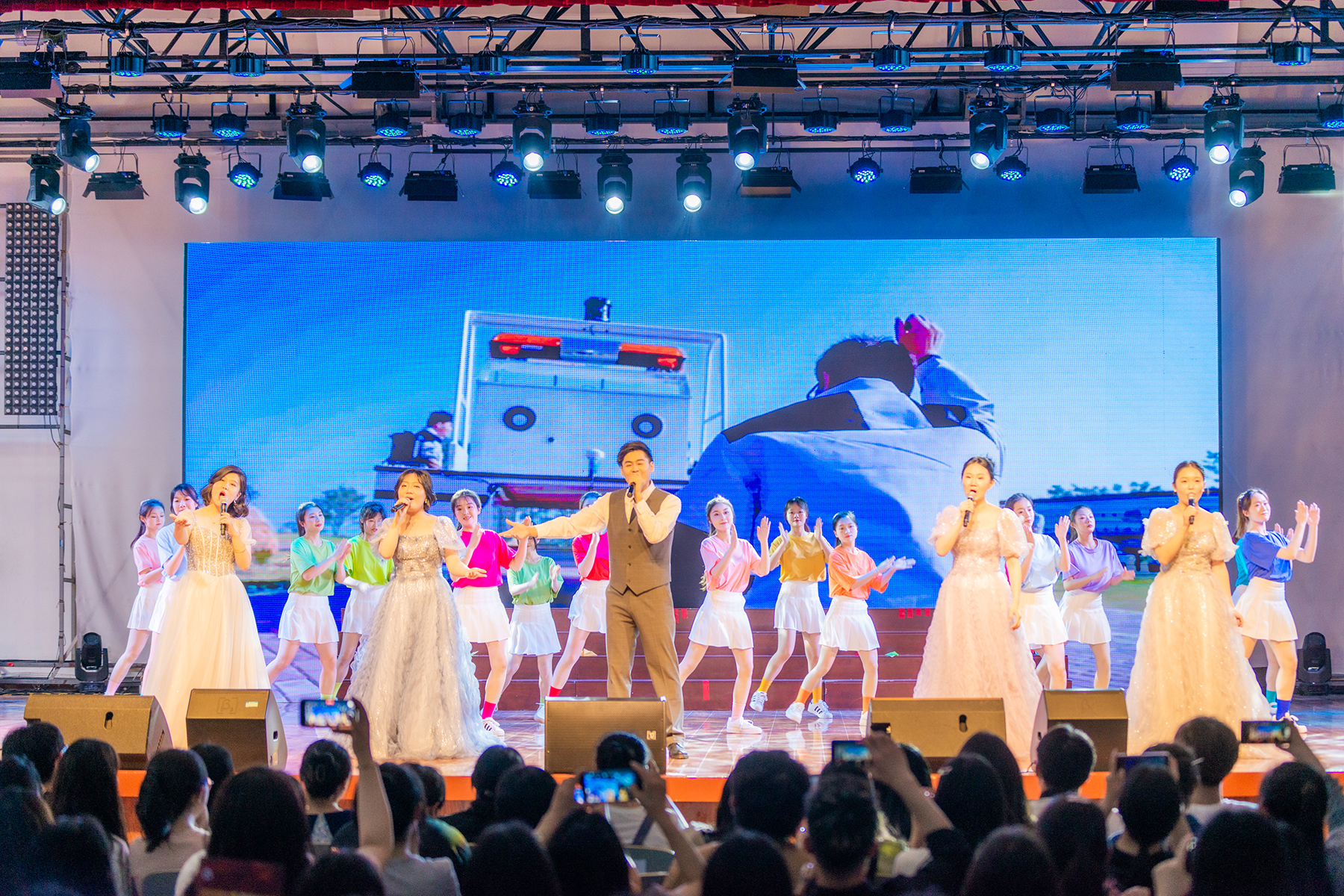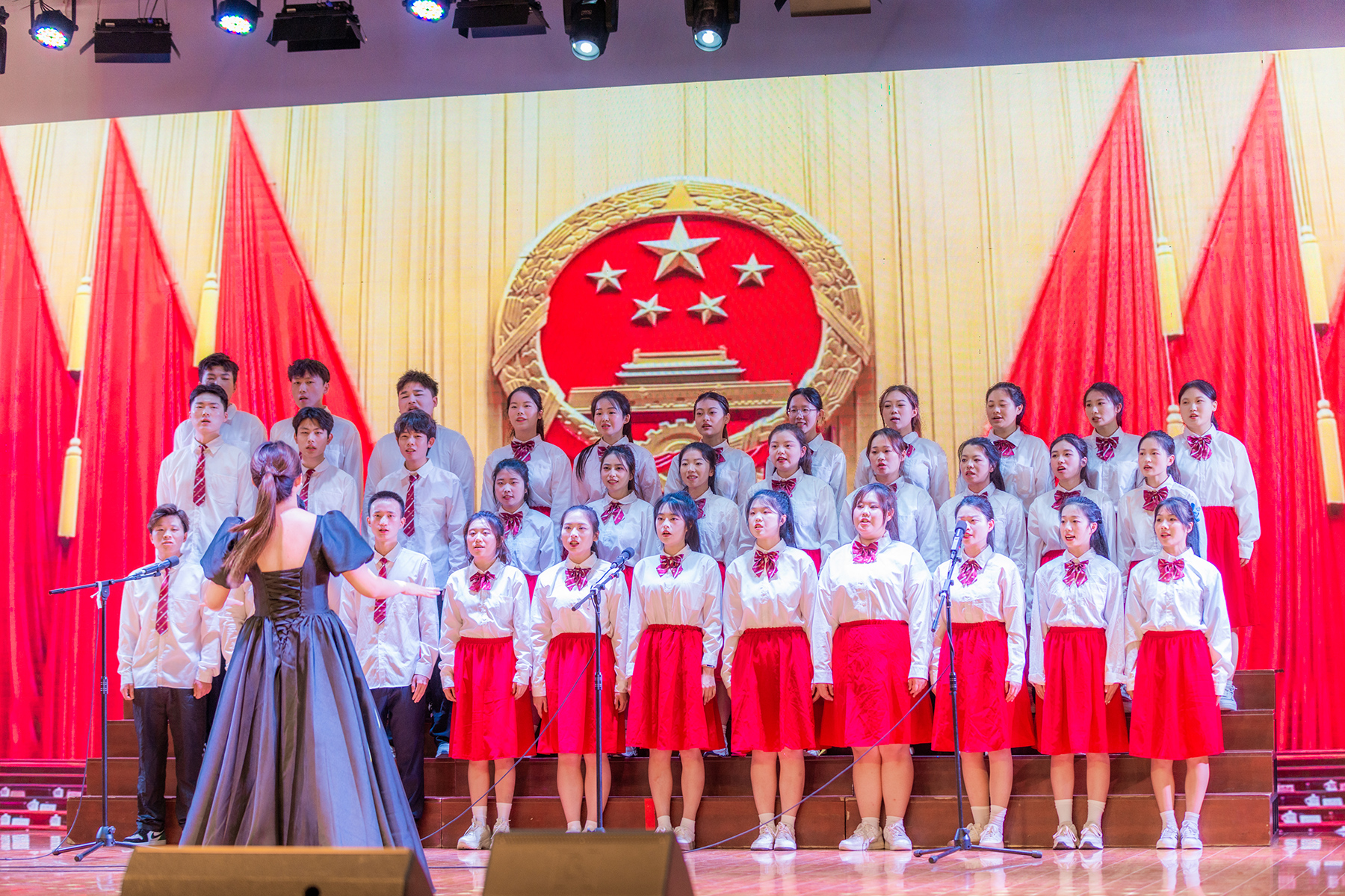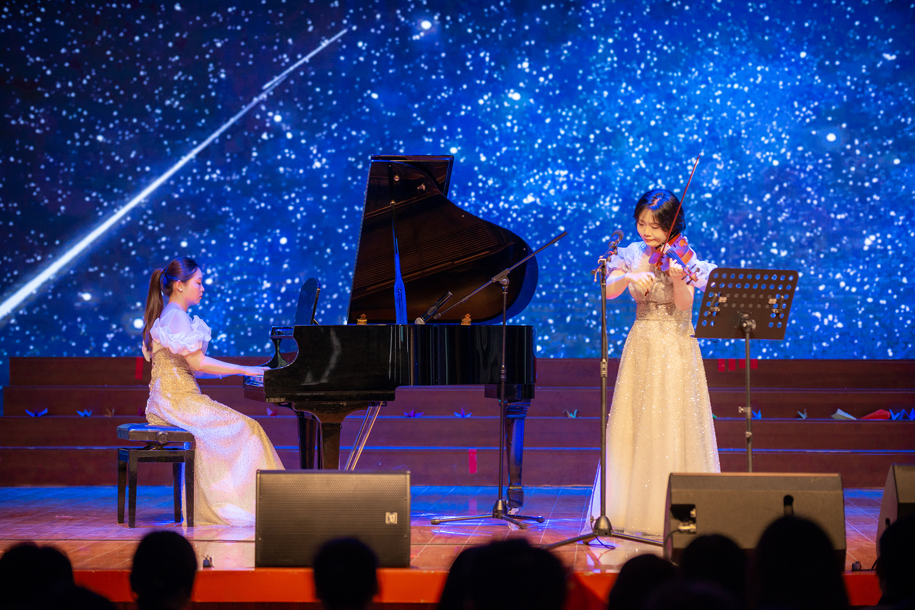 音乐会由古筝合奏《盛世国乐》拉开帷幕,展示了中华民族文化的恒久魅力和中国盛世的恢弘景象。钢琴小提琴协奏曲《以声入境》、小提琴合奏曲《与你同在》、钢琴独奏《辉煌的大圆舞曲》、四手联弹《拉德斯基进行曲》等表演,精彩纷呈,让人沉浸其中。师生共同演绎歌伴舞《我的未来不是梦》,丰富多变的节奏和青春洋溢的舞蹈将演出推向高潮;独唱《我和我的祖国》让观众充分感受到中华儿女对伟大祖国深厚的情感和炙热的爱;演出在温暖深情、大气磅礴的合唱《领航》中完美落幕。
