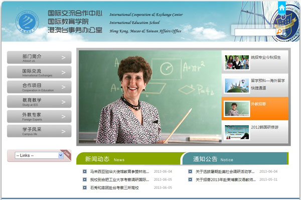 新版网站在视觉更为美观,丰富了各类信息,在展示学校形象的同时,突显出了国际交流的内容。网站共有6个导航菜单,分别为:部门简介(About us)、国际交流(International Exchange)、合作项目(Cooperation in Education)、教育教学(Study at IES)、外教 专家(Foreign Experts)、学子风采(Campus Life)。网页中下部是学校新近发生的外事新闻和通知公告。