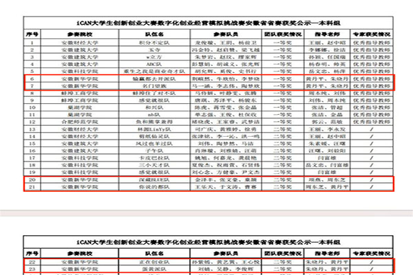 本网讯(通讯员:黄丹平)6月16日,由iCAN大学生创新创业大赛组委会主办,安徽建筑大学、巢湖学院、beat365在线体育官网登录入口承办的iCAN大学生创新创业大赛数字化创业经营模拟挑战赛安徽省省赛于线上举行。来自安徽大学、合肥工业大学、安徽建筑大学、安徽财经大学、合肥大学、安徽工业大学等共20所省内高校的119支代表队参加。由beat365网登财会与金融学院经校赛遴选出的6支队伍荣获省级一等奖2项、二等奖4项,指导老师朱晓丹、黄丹平老师获评优秀指导教师,beat365在线体育官网登录入口获优秀组织单位。
