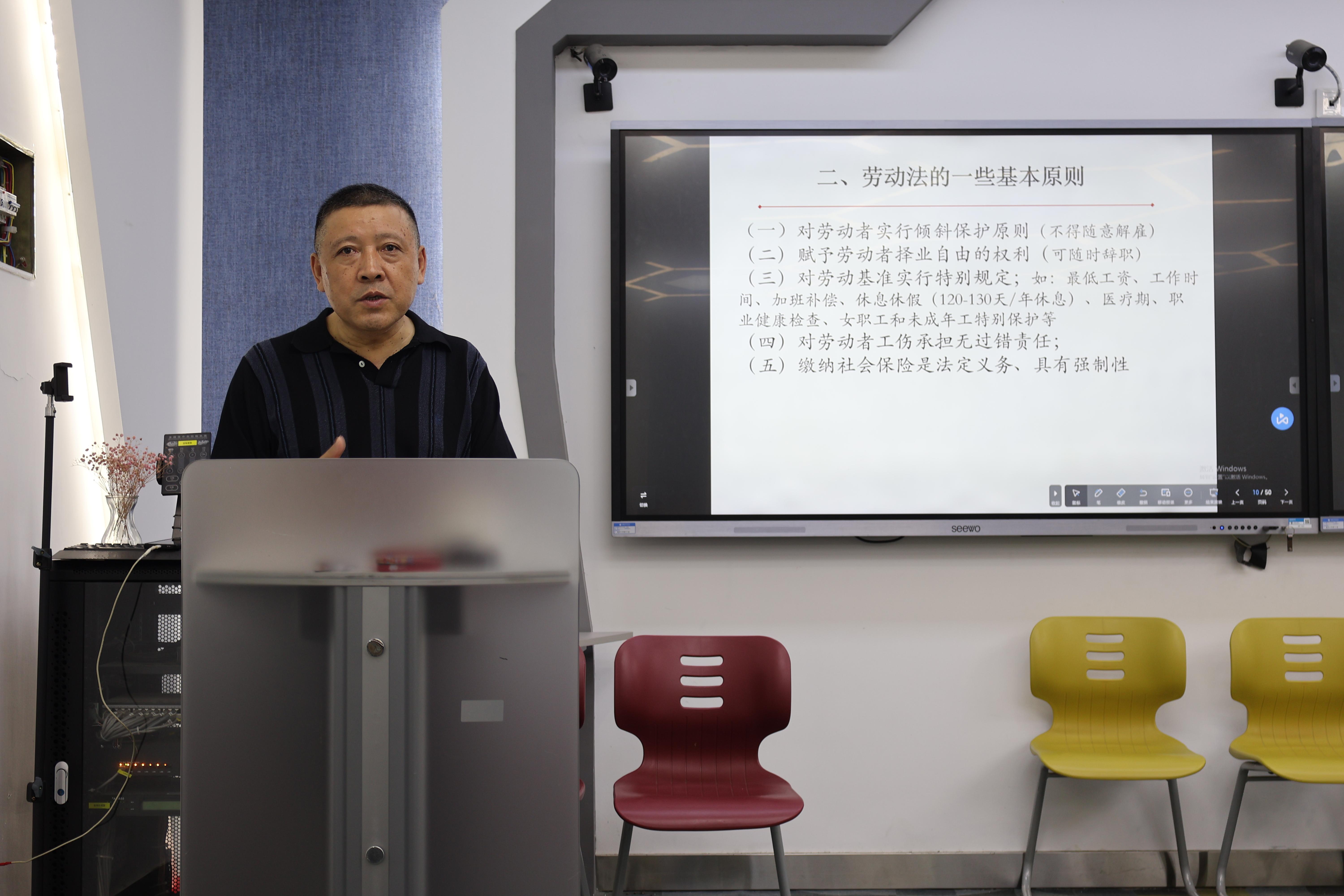 陈锋老师首先作题为《社会主义核心价值观在劳动法中的体现》的普法讲座。在声情并茂的讲演中,陈锋细致分析解读了我国劳动法的性质、作用、基本原则等内容,并结合多年办案经验,以案释法,对实务中的一些劳动人事纠纷典型案例进行剖析,为可能存在的法律风险提出切实可行的对策建议。