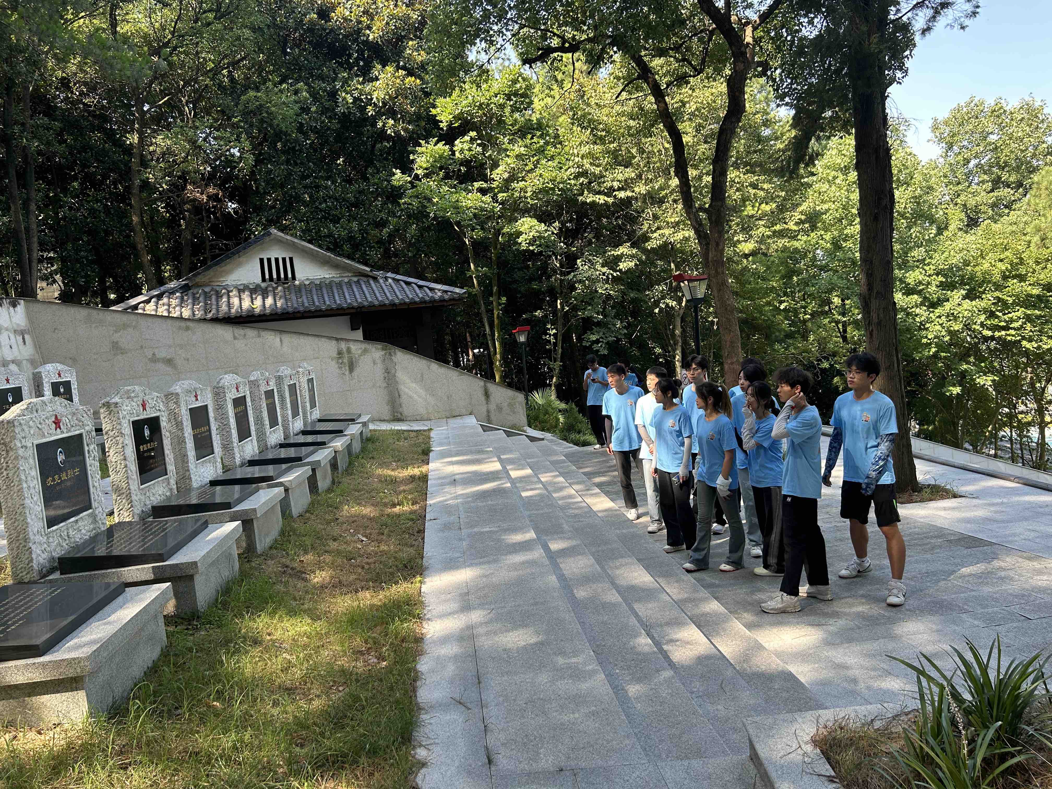 离开红军亭,实践团成员们进入烈士陵园墓地,烈士陵园工收存在不同时期英勇牺牲的203名革命烈士。在这里,团队成员们切身感受到更加浓烈的革命氛围。阳光透过树叶,洒落在亭子的青石地面上,营造出一种格外宁静而庄重的氛围。将士英烈亭的墙面上,镌刻着无数英烈的名字,每一个名字背后都蕴含着动人的故事。