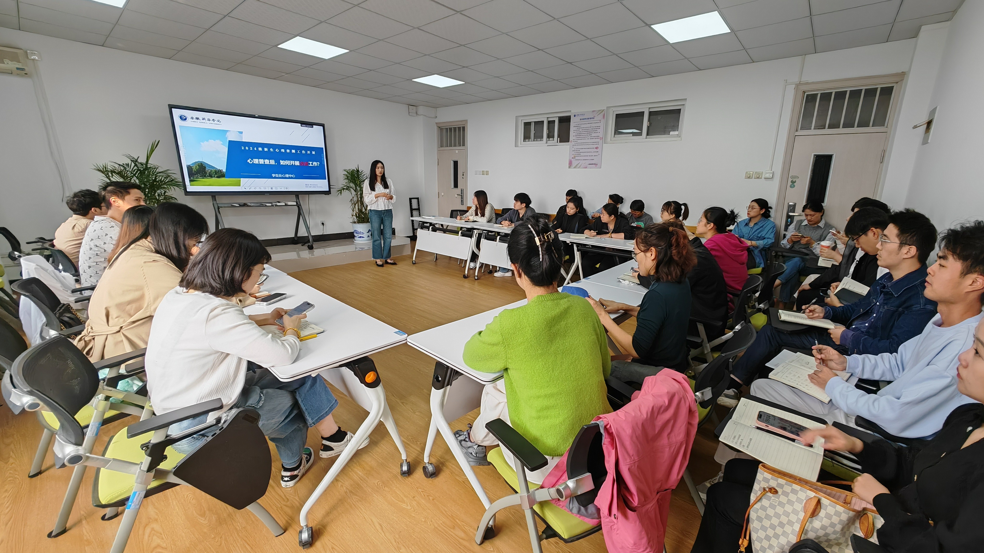 会议伊始,何倍作《心理普查后如何开展访谈工作》专题培训,涵盖“开展心理访谈的原因”“访谈原则与注意事项”“访谈流程的具体操作”以及“访谈后启动干预机制”四个重要方面进行系统而详尽的阐述。她指出,应高度重视普测问题背后新生心理需求问题,加强首要责任落实,引导学生积极求助,做好心理分类指导。