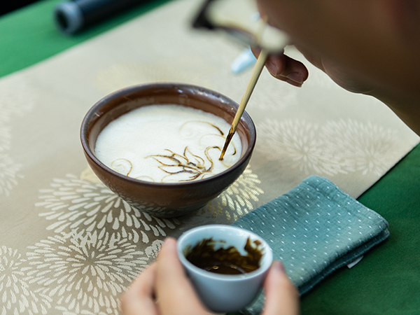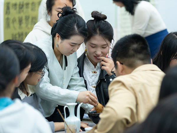 活动中,学生们在聆听朱彦老师的讲解后,亲自动手体验了“仿宋茶百戏”的制作过程。学生们尝试着在茶汤中绘制出各种图案,感受着茶文化与艺术的完美结合。这一过程中,学生们互帮互助,不仅锻炼了学生们的外语交际能力,也让他们对中华传统文化有了更深入的理解和体验。