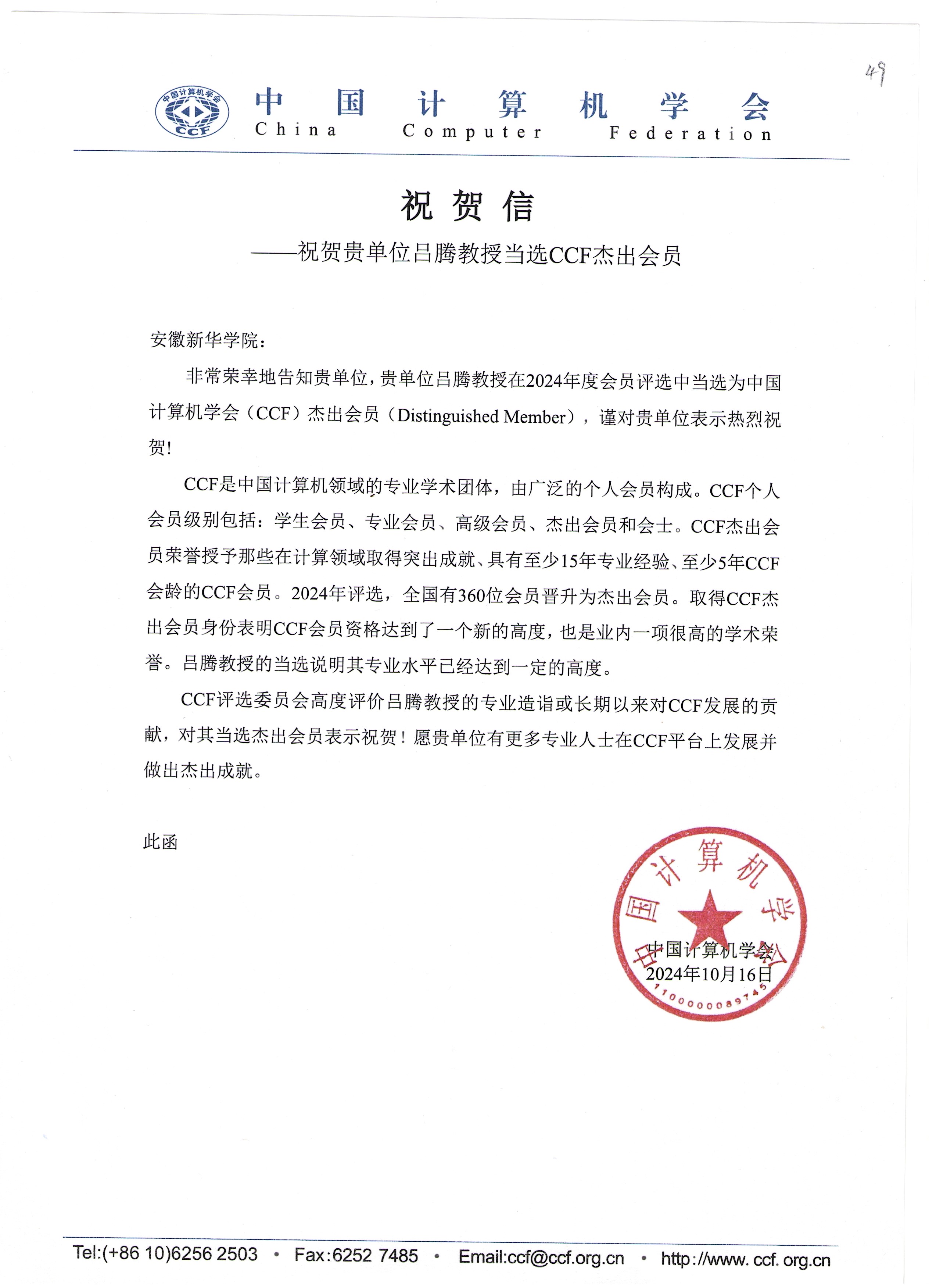 本网讯(通讯员:吕腾)近日,中国计算机学会(CCF)发来贺信,祝贺beat365网登吕腾教授当选为中国计算机学会杰出会员(Distinguished Member)。吕腾教授目前担任CCF主办的旗舰刊物《中国计算机学会通讯》“读编往来”栏目的编委,负责栏目的策划、组稿和撰稿工作,为CCF的发展做出了重要的贡献。