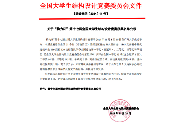 本网讯(通讯员:胡元超)2024年11月8至10日,第十七届全国大学生结构设计竞赛在广州大学成功举办。全国大学生结构设计竞赛是土木工程领域级别最高、规模最大的大学生创新竞赛,是由教育部、财政部为构建高校工程教育实践平台,进一步培养大学生创新意识、团队协同和工程实践能力,切实提高创新人才培养质量首次联合批准发文(教高函【2007】30号)的全国性9大学科竞赛资助项目之一。本届赛事吸引了包括清华大学、浙江大学、同济大学、香港大学等在内的100多所全国知名高校参加,总决赛队伍由全国31个省(自治区、直辖市)组织分区赛的595所高校、1863支参赛队伍中层层选拔产生。