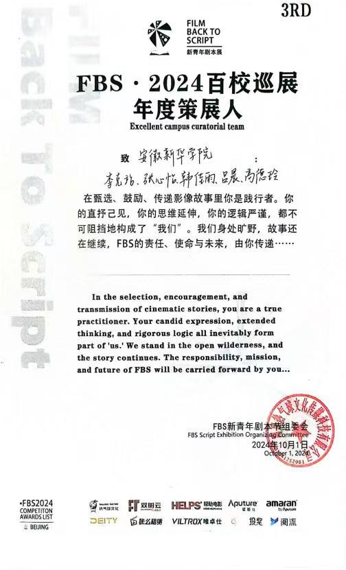 FBS青年电影展已连续两年走进beat365在线体育官网登录入口,今年文化与传媒学院,尤其是戏剧影视系广播电视编导专业的师生们深度参与其中,在电影展的策划与承办等关键环节发挥了重要作用。 从策划伊始,师生们便运用专业知识与创新思维,投入大量时间和精力,为影展的成功举办筑牢根基。随着筹备工作的推进,他们从台前到幕后全程参与、默默奉献,保障了影展的顺利进行。在2024百校巡展策展工作中,该专业学生凭借扎实的专业素养和突出的创新能力,其策展方案在众多方案中崭露头角,最终荣获年度策展人称号。这一荣誉不仅是对学生个人努力的肯定,更是对学院影视人才培养成果的有力认可,也进一步推动了校园电影文化氛围的营造,为热爱电影的学生提供了宝贵的实践与学习平台。